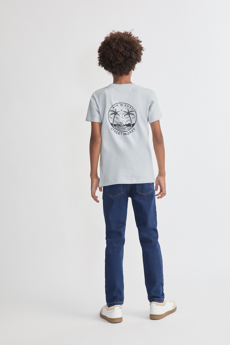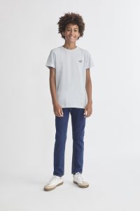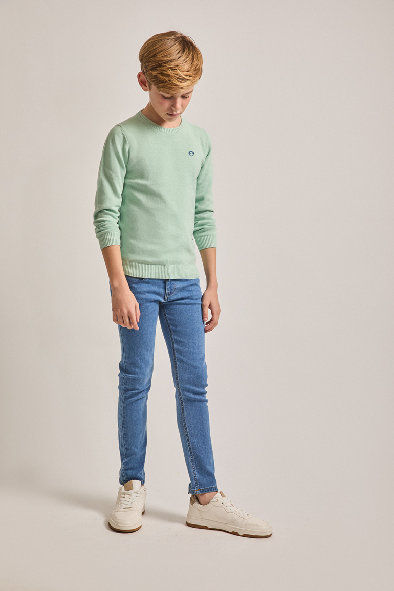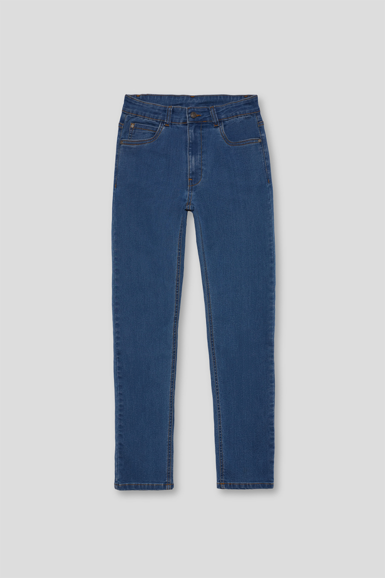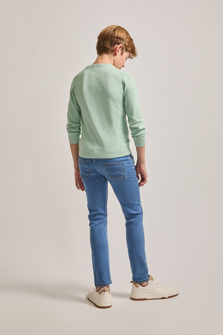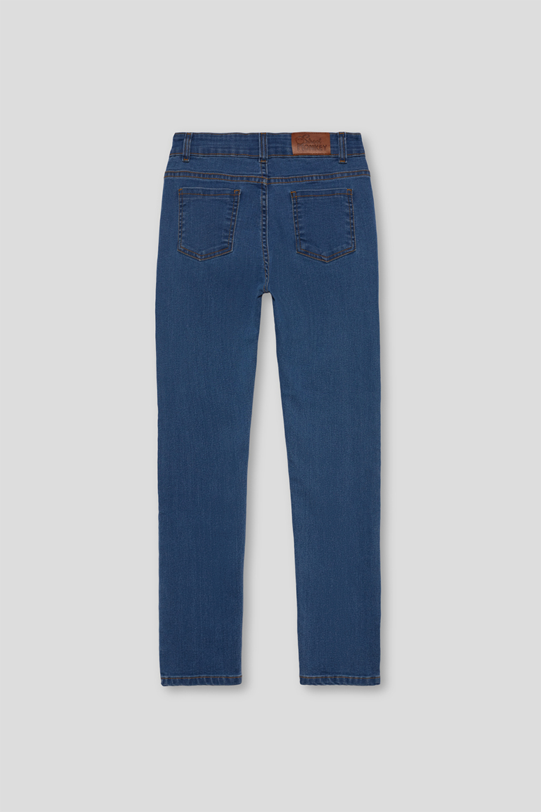 Pantalón vaquero en tejido suave y elástico. Modelo pitillo con 5 bolsillos, cierre de cremallera y botón.