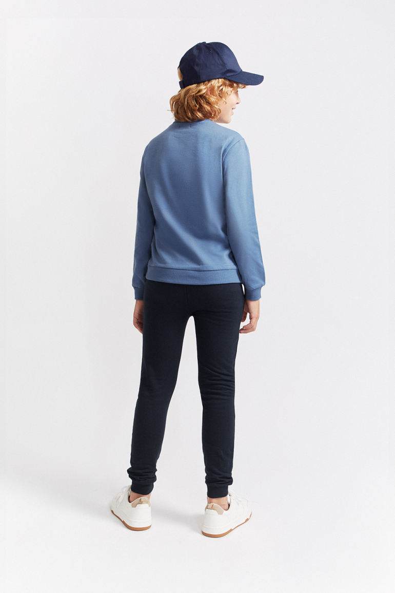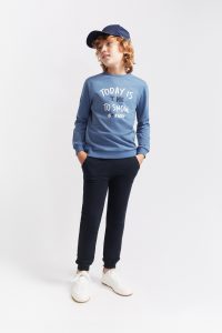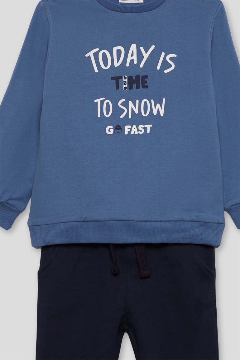 Chándal en color azul petróleo, con sudadera de manga larga, cuello redondo y texto estampado en el delantero: «Today is time to snow – Go fast». El pantalón es tipo jogger en azul noche, con cintura elástica, cordón ajustable y puños en los bajos. Interior afelpado, suave y calentito.