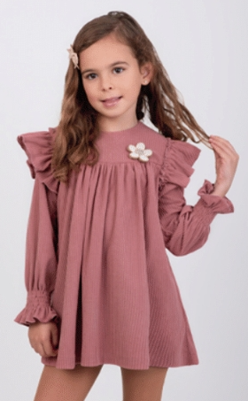 Vestido en pana-punto, color rosa empolvado, volantes en los hombros. Lleva un broche de flor como complemento. De la firma Vera.