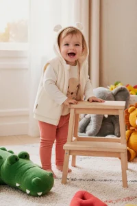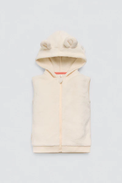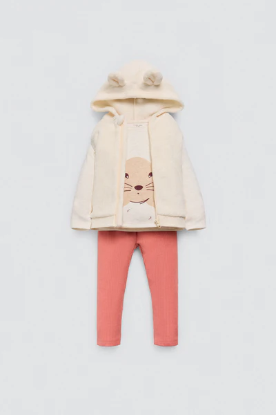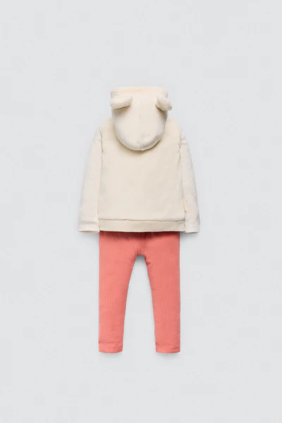 Conjunto formado por 3 piezas para bebé: camiseta de manga larga con dibujo de ardilla, pantalones y chaleco de pelo con cierre de cremallera. Confeccionado en algodón suave, con interior cálido. Diseño funcional para los primeros meses.
