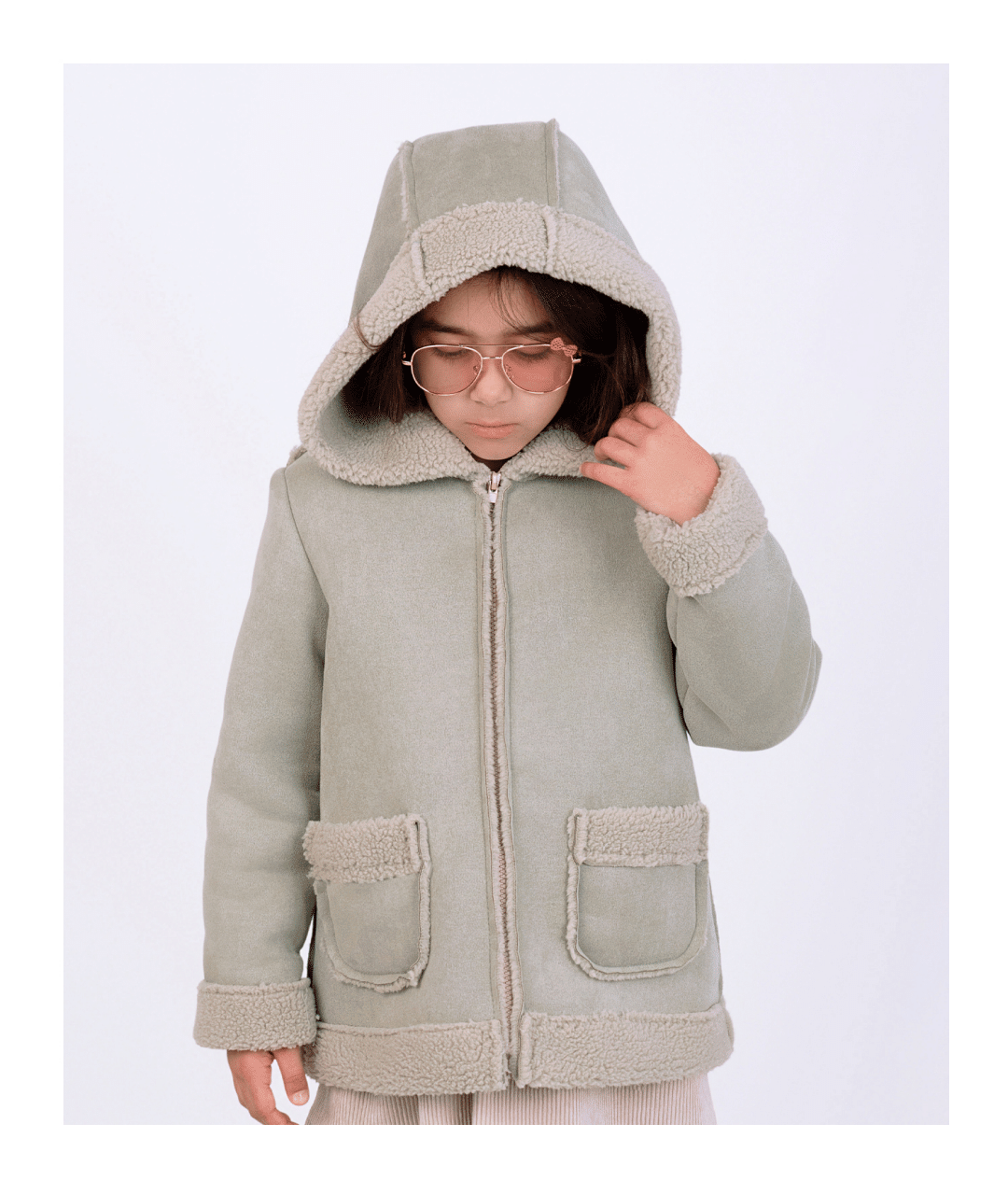 Abrigo unisex con capucha en color verde menta pastel. Tejido exterior simulando piel vuelta e interior borreguito, muy calentito para el invierno. De la firma Nekenia.