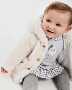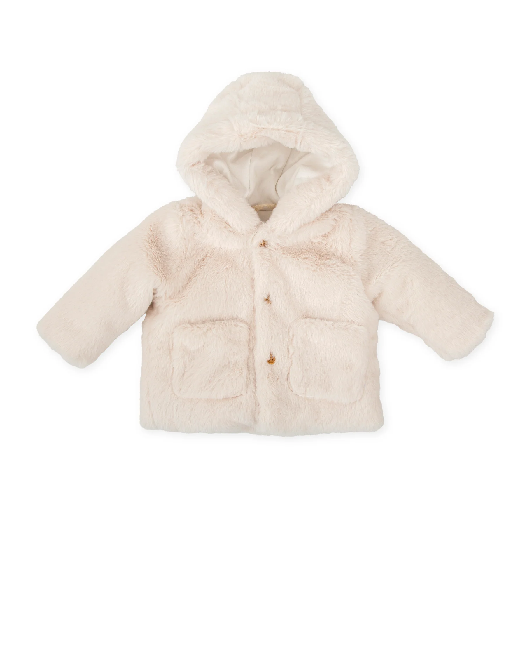 Abrigo con capucha de pelo sintético muy suave y con relleno en el interior. Forro en algodón 100%. Color beige. De la firma Tutto Piccolo.