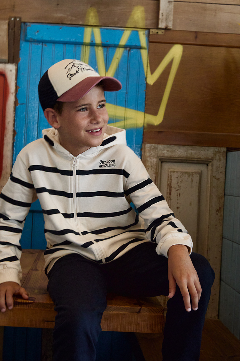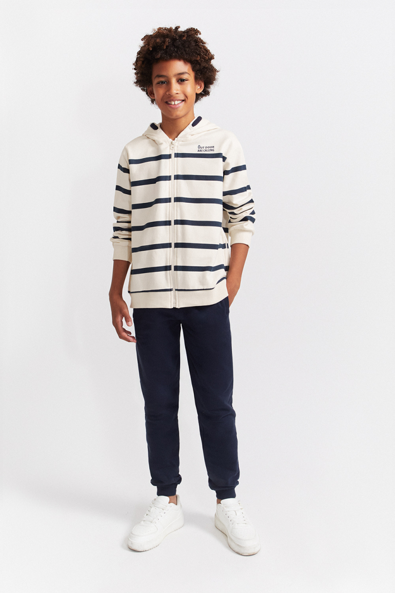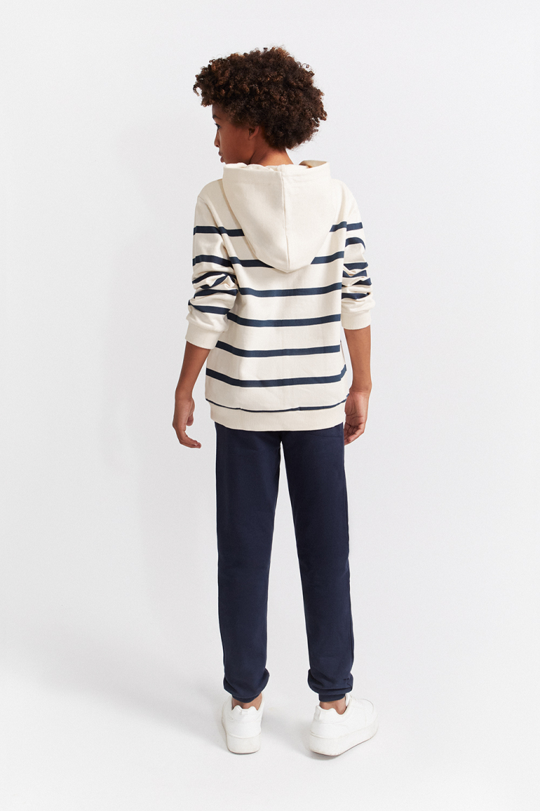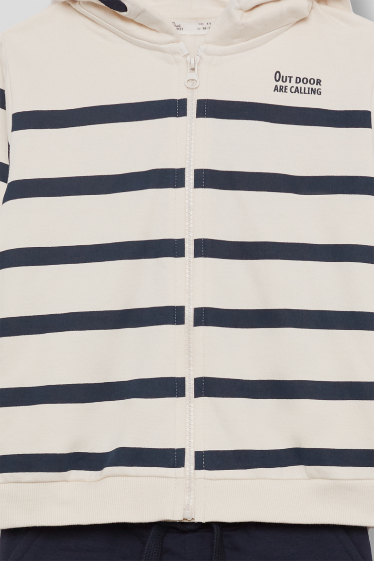 Chándal de dos piezas formado por sudadera con capucha en color crudo con estampado de rayas marino distribuidas de forma horizontal. Presenta cierre frontal de cremallera, bolsillos laterales y detalle tipográfico bordado en el pecho. El interior es afelpado, ideal para los días fríos. El pantalón es de punto en color marino, con cintura elástica y bajos ajustados tipo jogger.