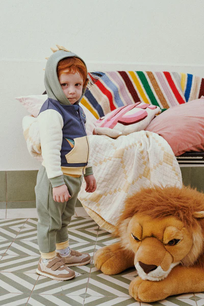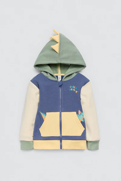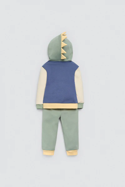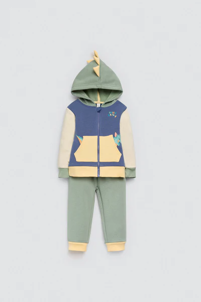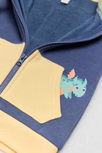 Chándal de bebé con chaqueta de cremallera y pantalón largo afelpado. Estampado divertido de dinosaurios en alegres colores. Ideal para días de frío y perfecto para vestir y desvestir fácilmente.