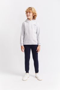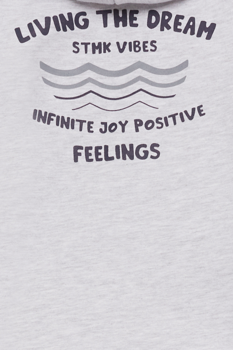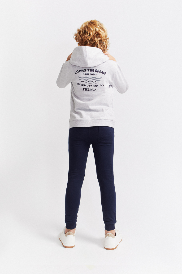 Chándal formado por Sudadera con capucha en color gris vigoré claro, confeccionada en tejido suave y cómodo. Presenta diseño frontal minimalista con texto “STMK VIBES” en el pecho y gráfico tipográfico en la espalda con mensaje positivo en contraste marino. Acabados en canalé en puños y bajo para un mejor ajuste. El pantalón es tipo jogger, de punto elástico en color azul marino, con cinturilla cómoda y bajos ajustados.
