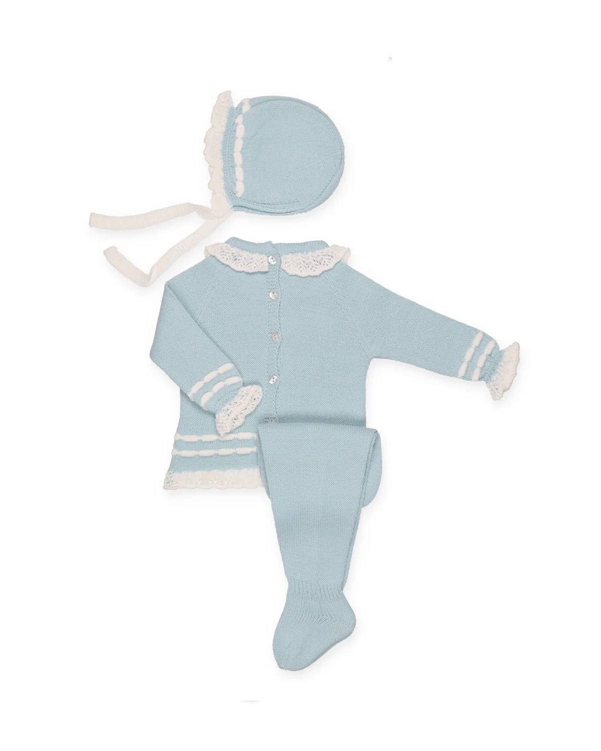 Conjunto de punto de 3 piezas en color verde y beige, formado por Jersey de lorzas en el delantero y detalles calados, cuello redondo, punto fino y diseño delicado; Polaina  y Gorro sencillo.