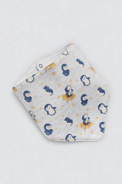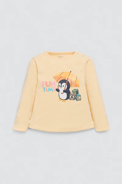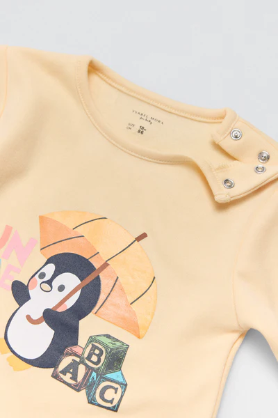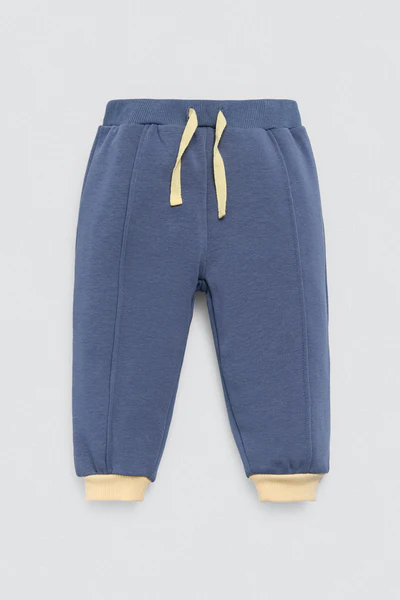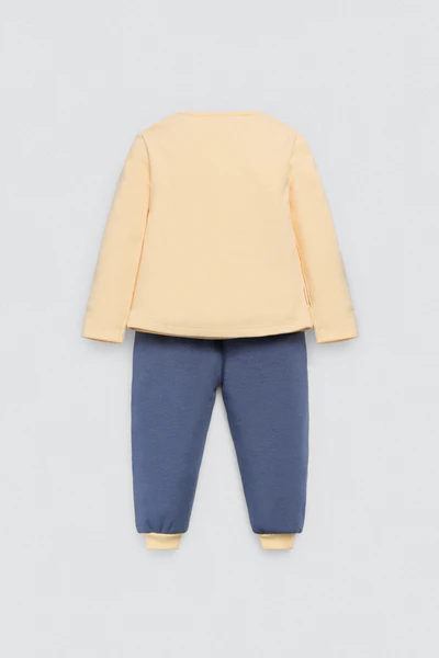 Conjunto de algodón natural para bebé formado por una camiseta, bandana y pantalones con cintura ajustable en azul marino y un dulce amarillo. Interior afelpado, perfecto para los meses más fríos.