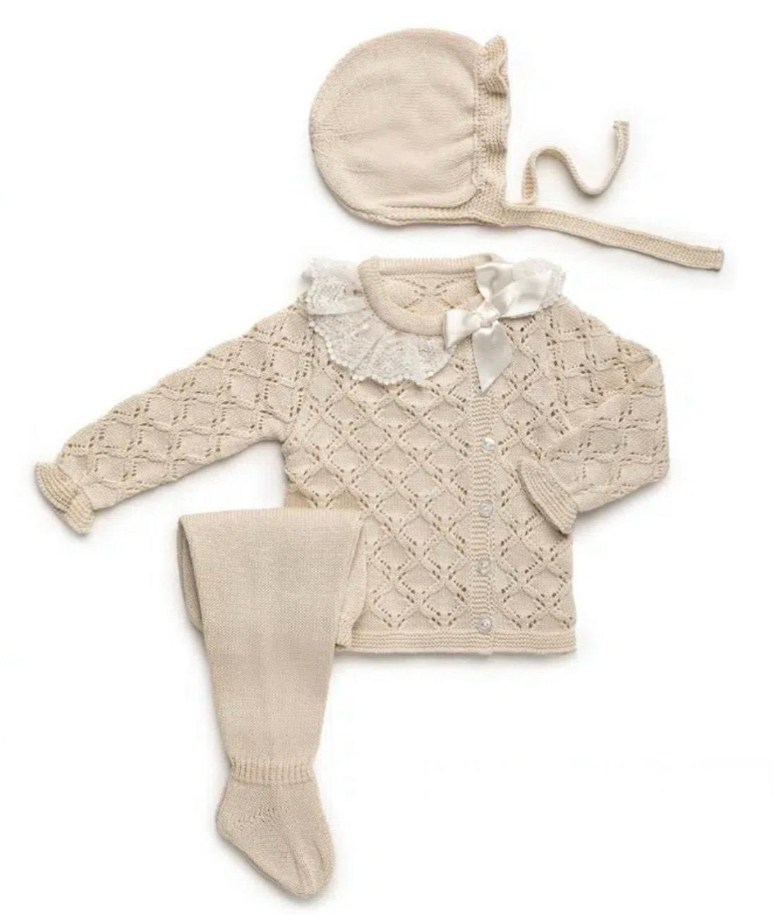 Conjunto de 3 piezas formado por jersey de hilo abierto por delante en color crema,, cuello con volante de encaje; polaina y gorro de punto básico y diseño delicado en color crema.
