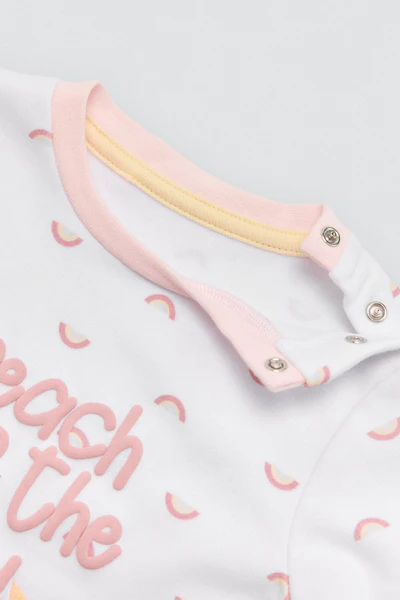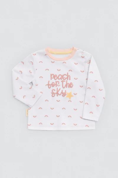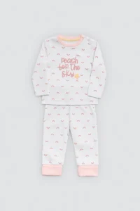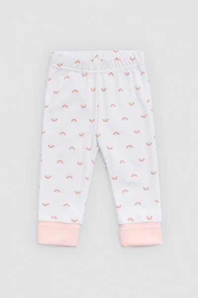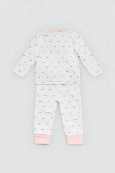 Set infantil y/o pijama de manga larga y pantalón largo con interior afelpado. Confeccionado en algodón natural, con estampado colorido de arcoíris y detalles dulces en blanco y rosa. Un conjunto ideal para días fríos con mucho estilo. De la firma Ysabel Mora.