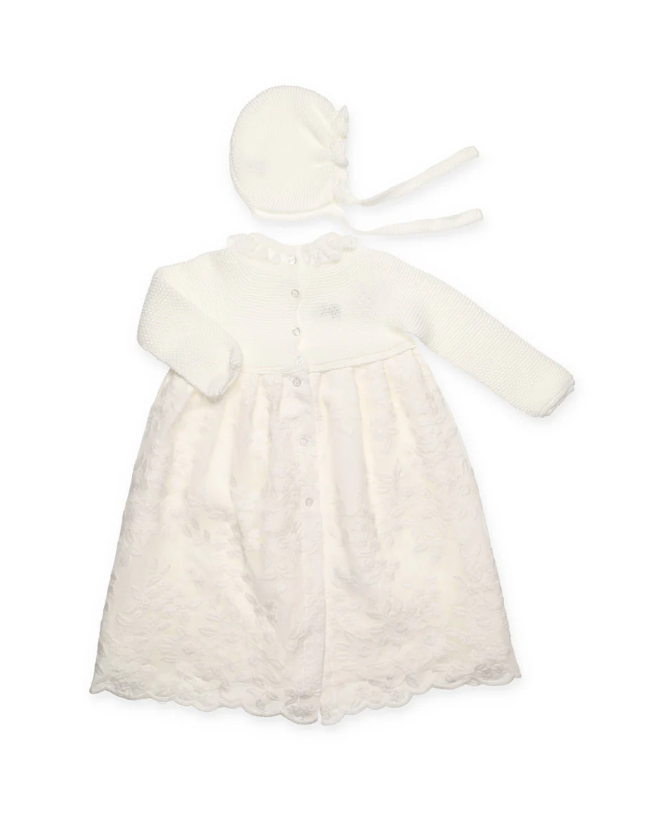 Faldón de manga larga con cuerpo de punto y detalles fruncidos en la parte delantera. Falda de tejido liso con aplicación de encaje todo en color beige. Cierre trasero con botones. Capota a juego. Incluye forro interior para mayor comodidad.