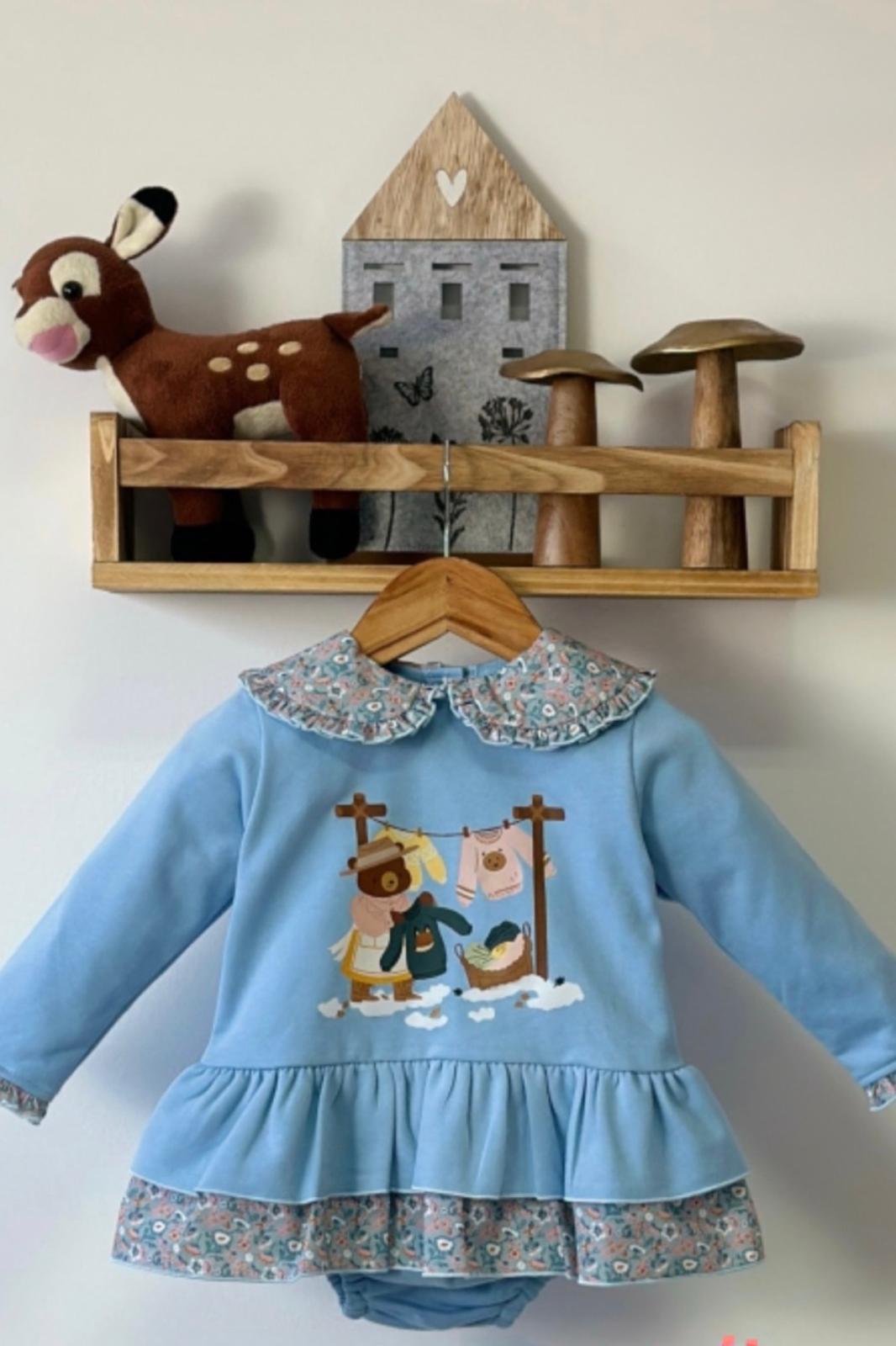 Jesusito y braguita a juego en color azul, combinado cuello, puños y volantes en un dulce estampado liberty.