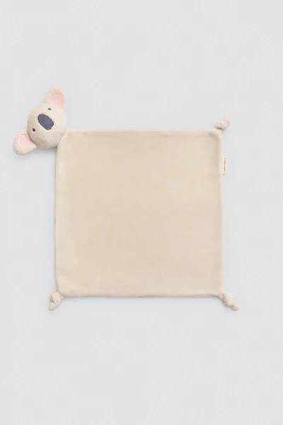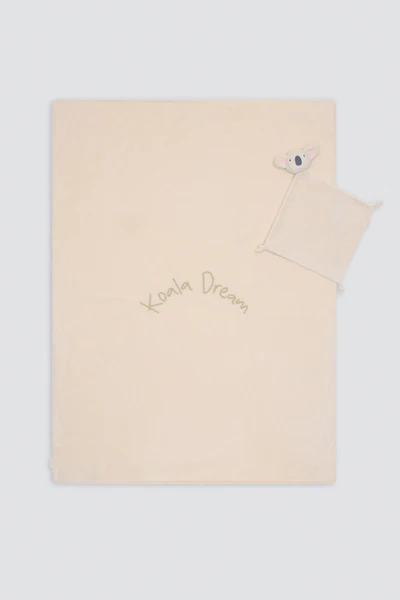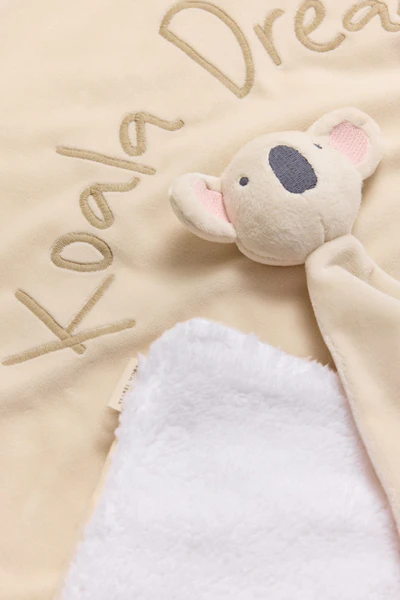Conjunto de manta suave y doudou con diseño de koala. En tono pastel, ideal como regalo de nacimiento. Proporciona calidez y acompañamiento emocional al bebé desde los primeros meses. De la firma Ysabel Mora.