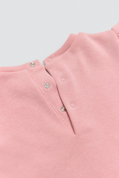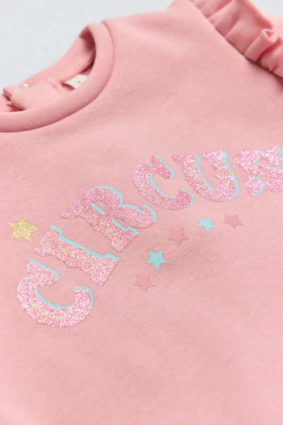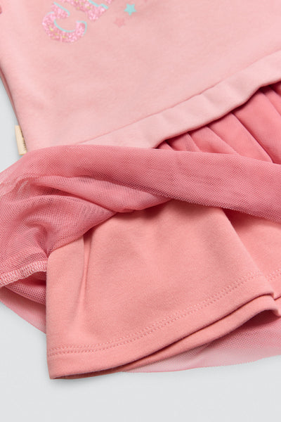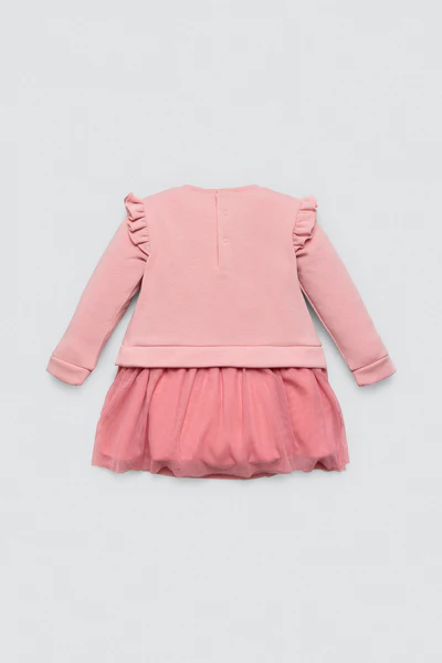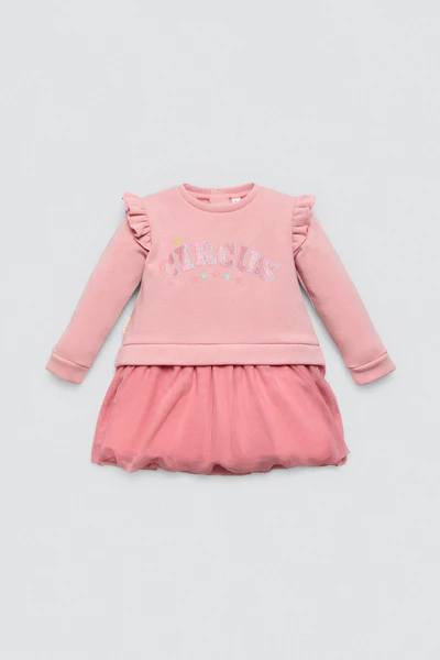 Vestido para bebé con manga larga y falda de tul en color rosa. Interior afelpado para mayor calidez. Estampado de circo en tonos suaves. Ideal para eventos, fotos o celebraciones, combinando estilo y abrigo.