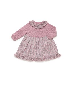 Vestido de manga larga con cuerpo de punto estructurado en color maquillaje. La falda, con estampado de pequeñas flores, se completa con un cuello y volante a juego.