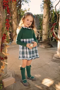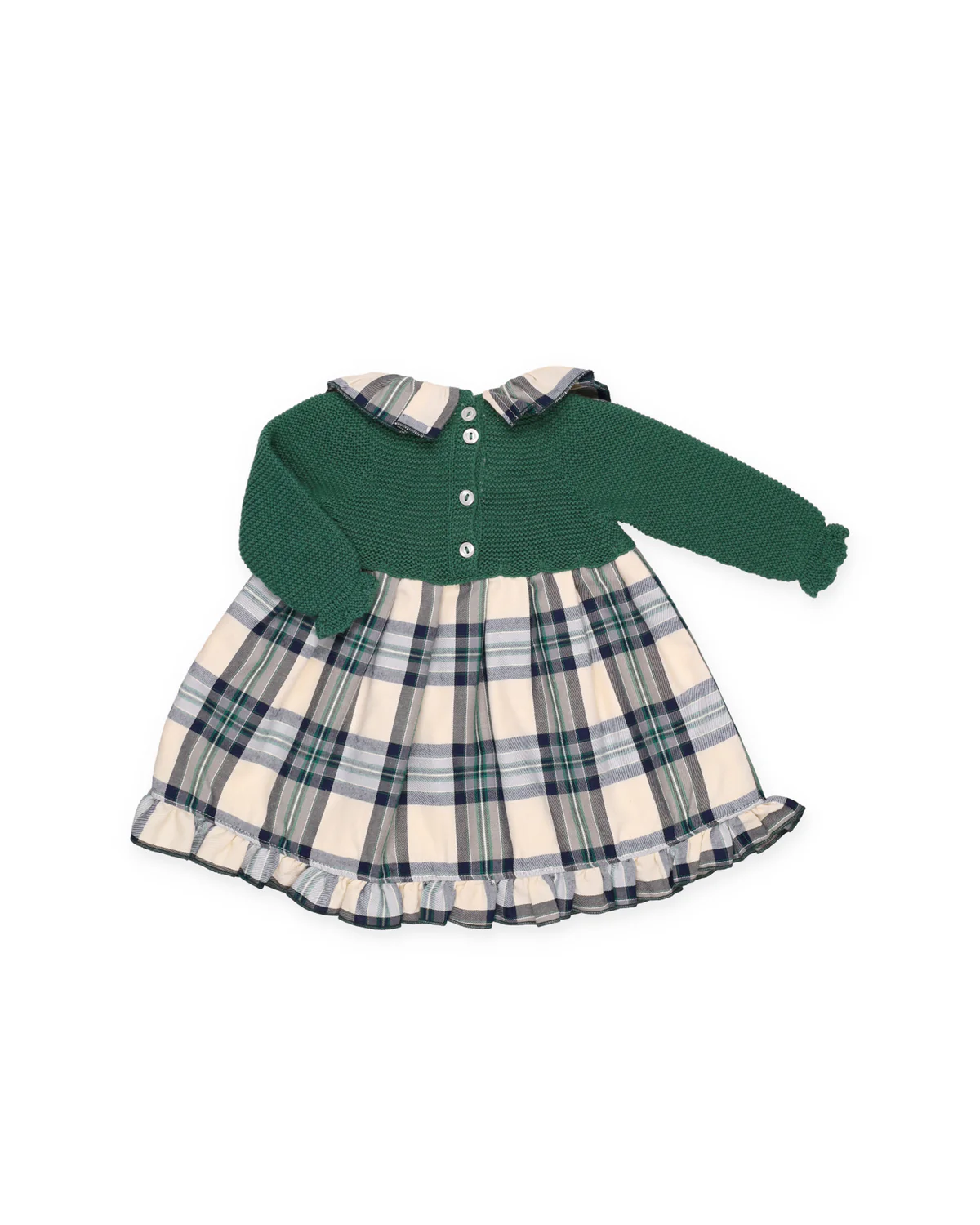 Vestido de manga larga con cuerpo de punto tricot en verde musgo y falda de tejido a cuadros en crudo, verde y azul. Cuello volante a juego con el tejido de la falda. Un conjunto cálido y equilibrado, ideal para el invierno.