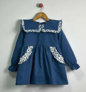 Vestido en color azul marino combinado con volante floral en cuello y bolsillos. Vestido en tejido de felpa con interior cardado. De la firma Mon Petit Bonbon.