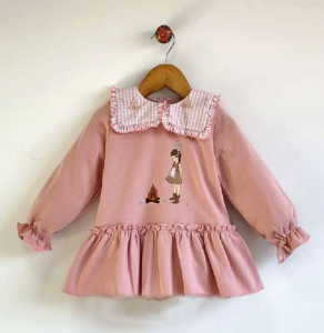 Vestido en color rosa suave, decorada con india, volante bajo y precioso cuello con volante rizado en tejido vichy. Tejido felpa con interior cardado. De la firma Mon Petit Bonbon.